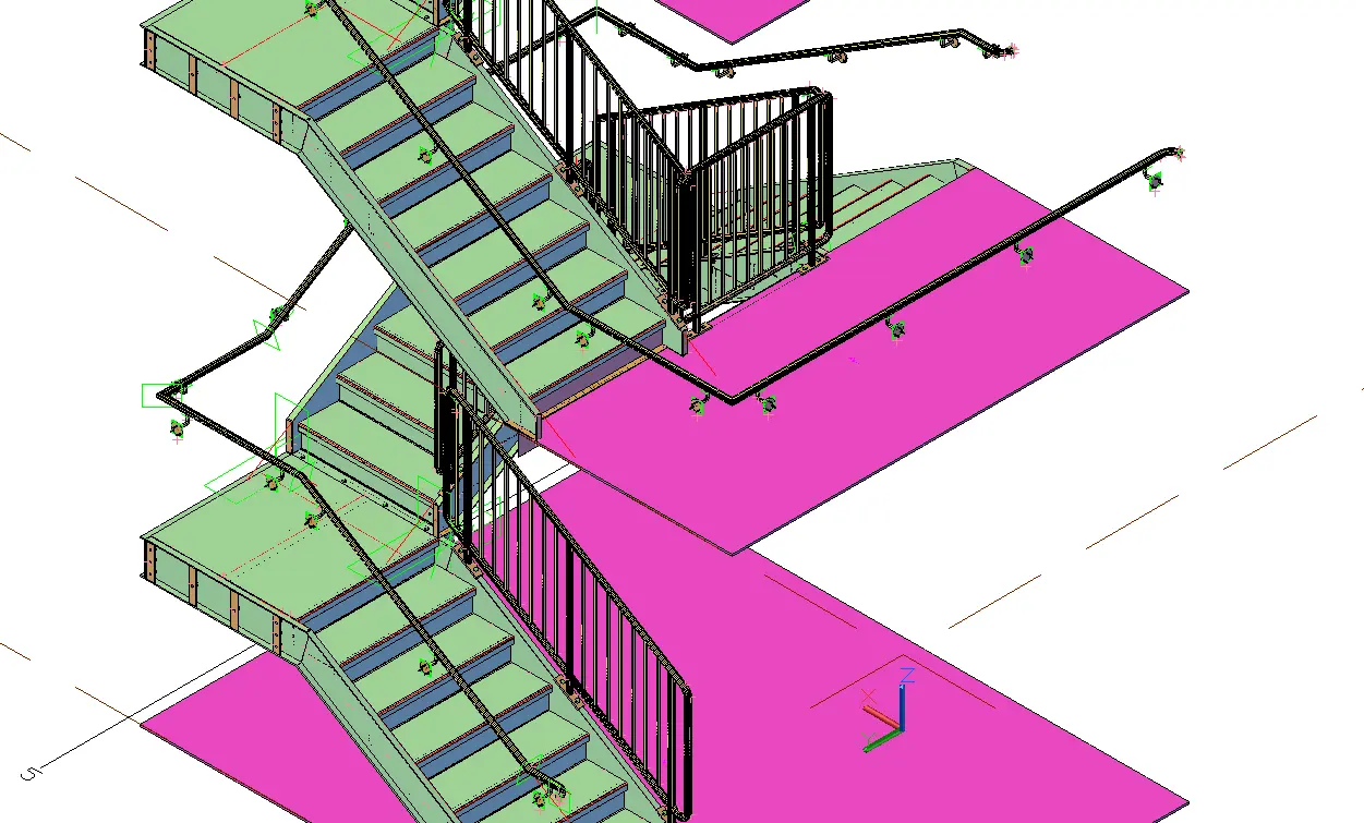 Construction of several 3-storey stairwells in residential buildings. The mandate included modeling, 2D drafting with Autodesk Revit and shop drawings with Autodesk Advance Steel.