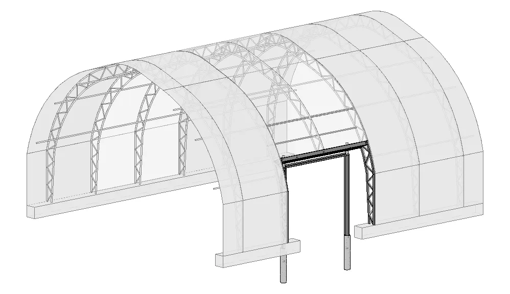 Addition of a side door in a fabric dome to facilitate access to a silo. The mandate included 2D modeling and drafting with Autodesk Revit.
