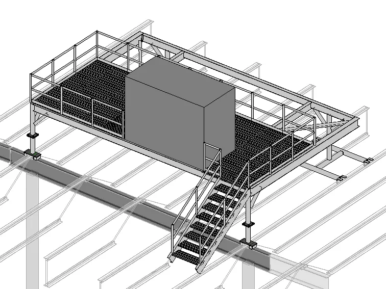 Design of a platform for the addition of equipment weighing over 5,000 kg on a roof. The mandate included 2D modeling and drafting with Autodesk Revit.