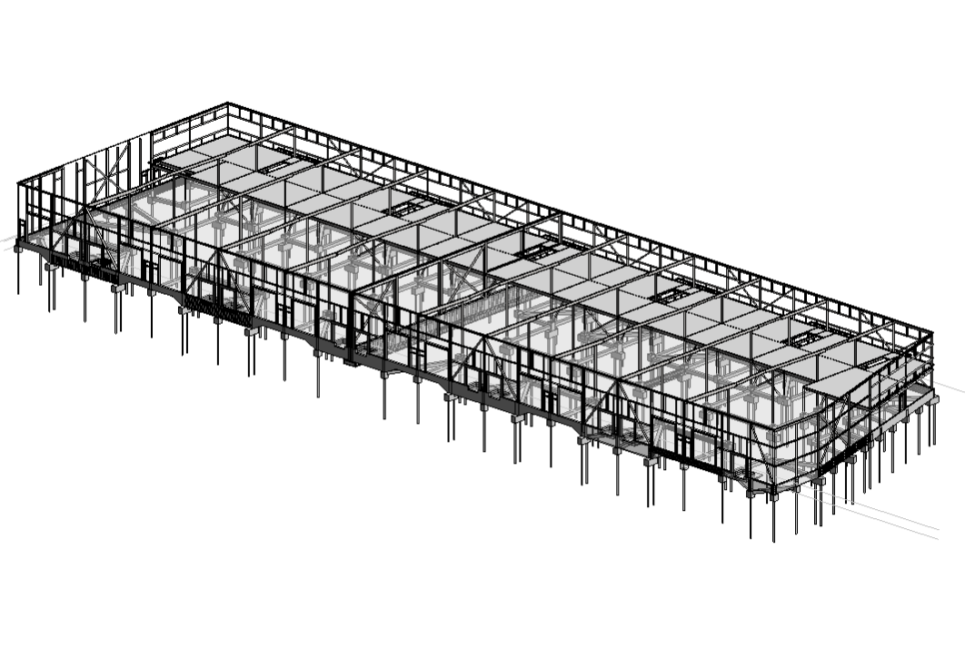 Design of a weatherproof building for unloading and storage. The mandate included modeling and drafting with Autodesk Revit.