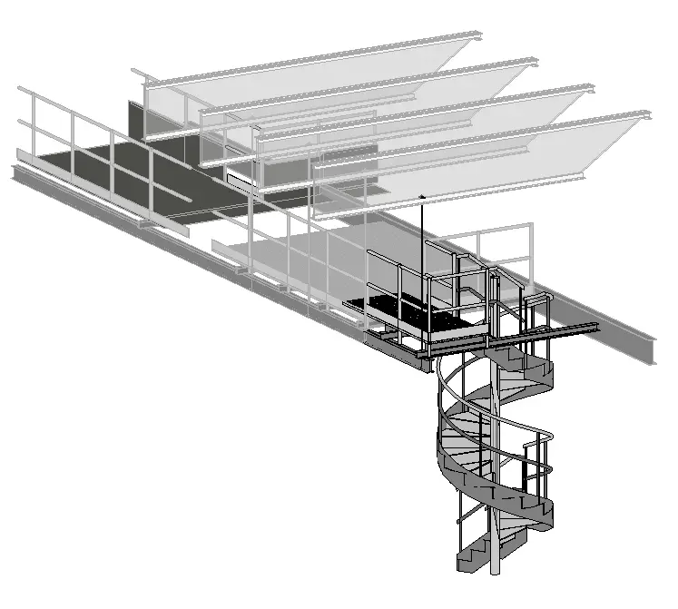 Design of a spiral staircase for equipment maintenance. The mandate included 2D modeling and drafting with Autodesk Revit.